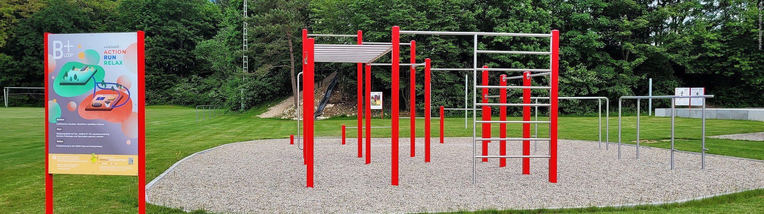 Auf dem Gelände des B+ Zentrums in Blossenau könnt ihr im ACTION-Bereich den Calisthenics-Parcours, Boulderblock und Slacklines nutzen oder eine Runde Volleyball und Fußball spielen. Auf dem RUN trainiert ihr auf verschiedenen Steigungen eure Lauftechnik und (Kraft-) Ausdauer. Trainingstipps gibt es unter www.blossenau.de.Die Waldoase lädt zum RELAXen und Waldkino ein.