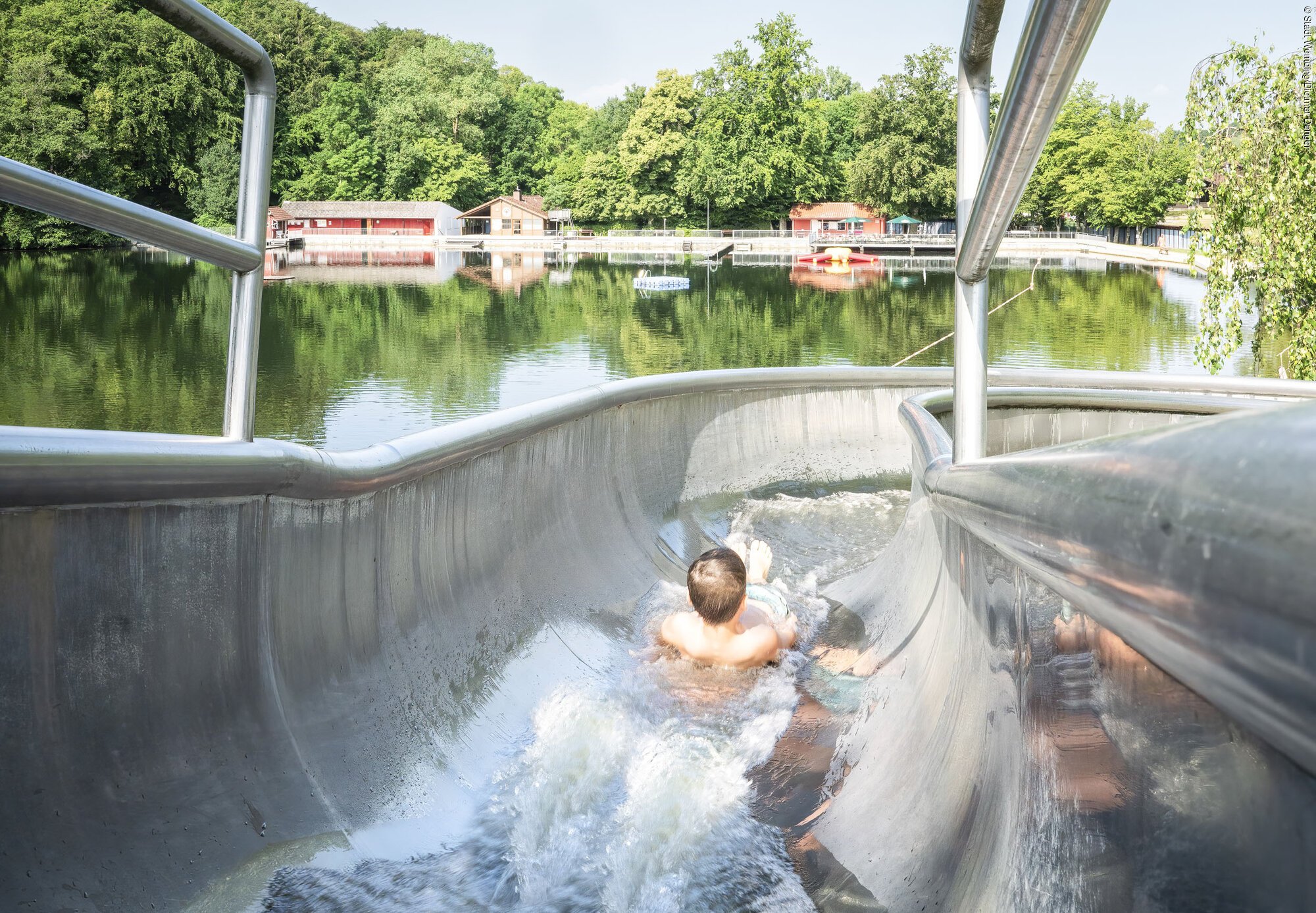 Idyllisch gelegener Naturbadesee mit großzügiger Liegewiese, Seeterrasse sowie Spielmöglichkeiten an Land und im Wasser, wie z. B. der 70 m langen Wasserrutsche, Beachvolleyballfeld, Schaukel und einem sandigem Wasserspielplatz mit großem Holzschiff. Jüngere Gäste können im Kleinkinderbecken plantschen.
