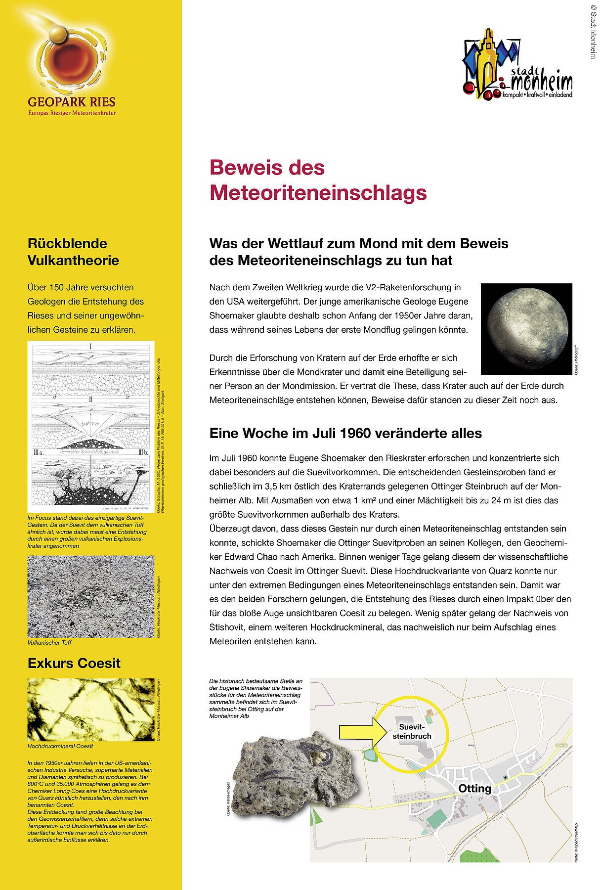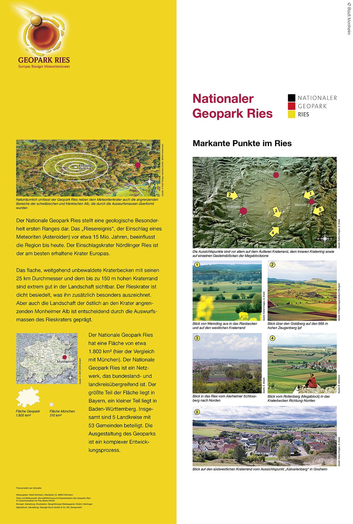 Mehrere Schautafeln stellen einen interessanten Erstkontakt zum UNESCO Global Geopark Ries her und verschaffen Besuchern und Besucherinnen einen Überblick, von welchen Standorten aus Besucher die Kraterstruktur im Gelände besonders gut erkennen können. Daneben überrascht die Geopark Infostelle Monheim mit einer Vielzahl „lokaler“ Themen: Das im nahe gelegenen Steinbruch Otting untersuchte Suevitgestein verwandelte den Vulkankrater Nördlinger Ries quasi „über Nacht“ zum Meteoritenkrater. Schautafeln zeugen von den Karstformen der Monheimer Alb, dem südlichsten Ausläufer der Frankenalb. Die Auswirkungen des Riesereignisses auf die Monheimer Alb und die spannende Landschaftsgeschichte um das verschüttete Tal des Urmains bei Monheim runden das Wissens-Spektrum der Monheimer Geopark Infostelle ab.