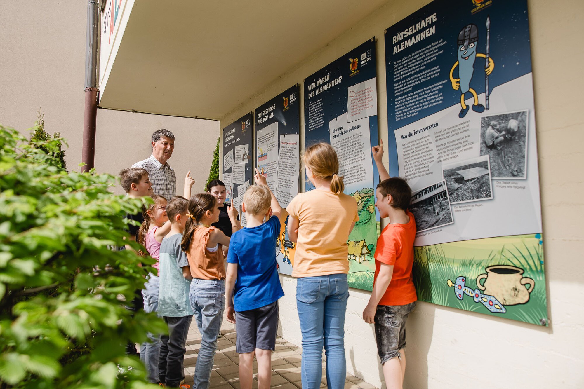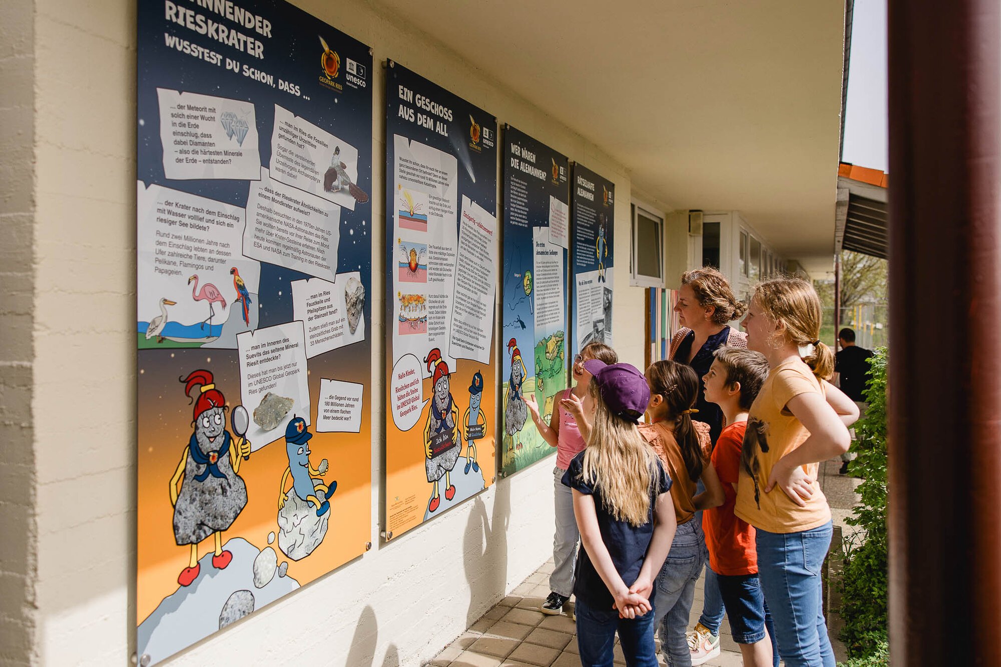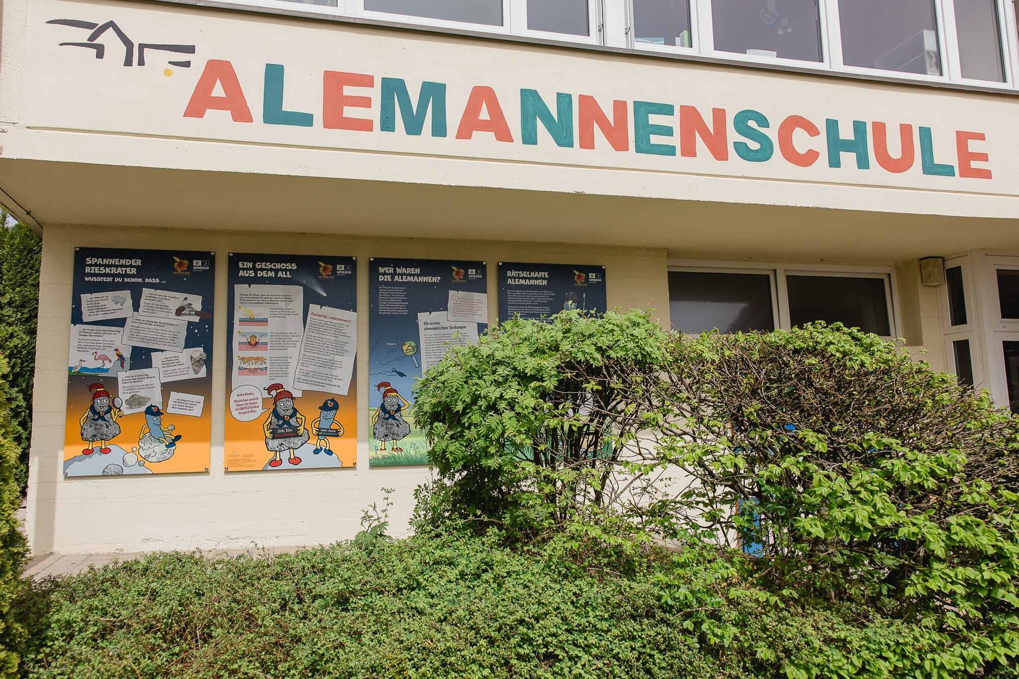 Da die Alemannenschule Kirchheim am Ries auf einem ehemaligem Alemannenfriedhof gebaut wurde, wurde neben den Besonderheiten des UNESCO Global Geoparks Ries mit seinem Meteoritenkrater das Thema Alemannen aufgegriffen und für Kinder aufbereitet. Die Tafeln der Infostelle sind im Außenbereich der Schule angebracht.