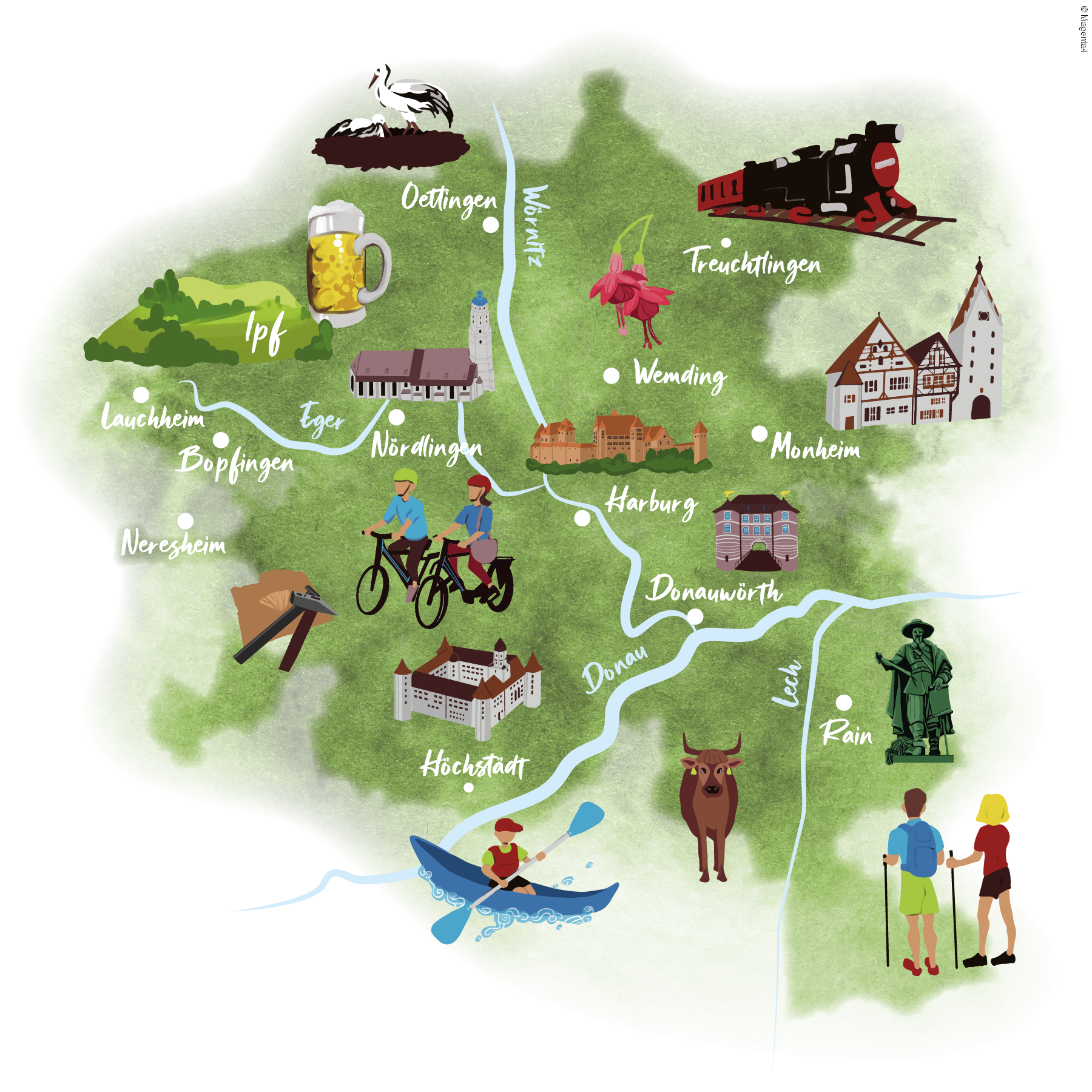 Zahlreiche Orte im Ferienland DONAURIES liegen an einer bedeutenden alten Handels- und Salzstraße in Richtung Süden, die heutige Bundesstraße 2 als Teil der beliebten Romantischen Straße. Die Städte und Gemeinden befinden sich im Schnittpunkt der bayerischen Stämme