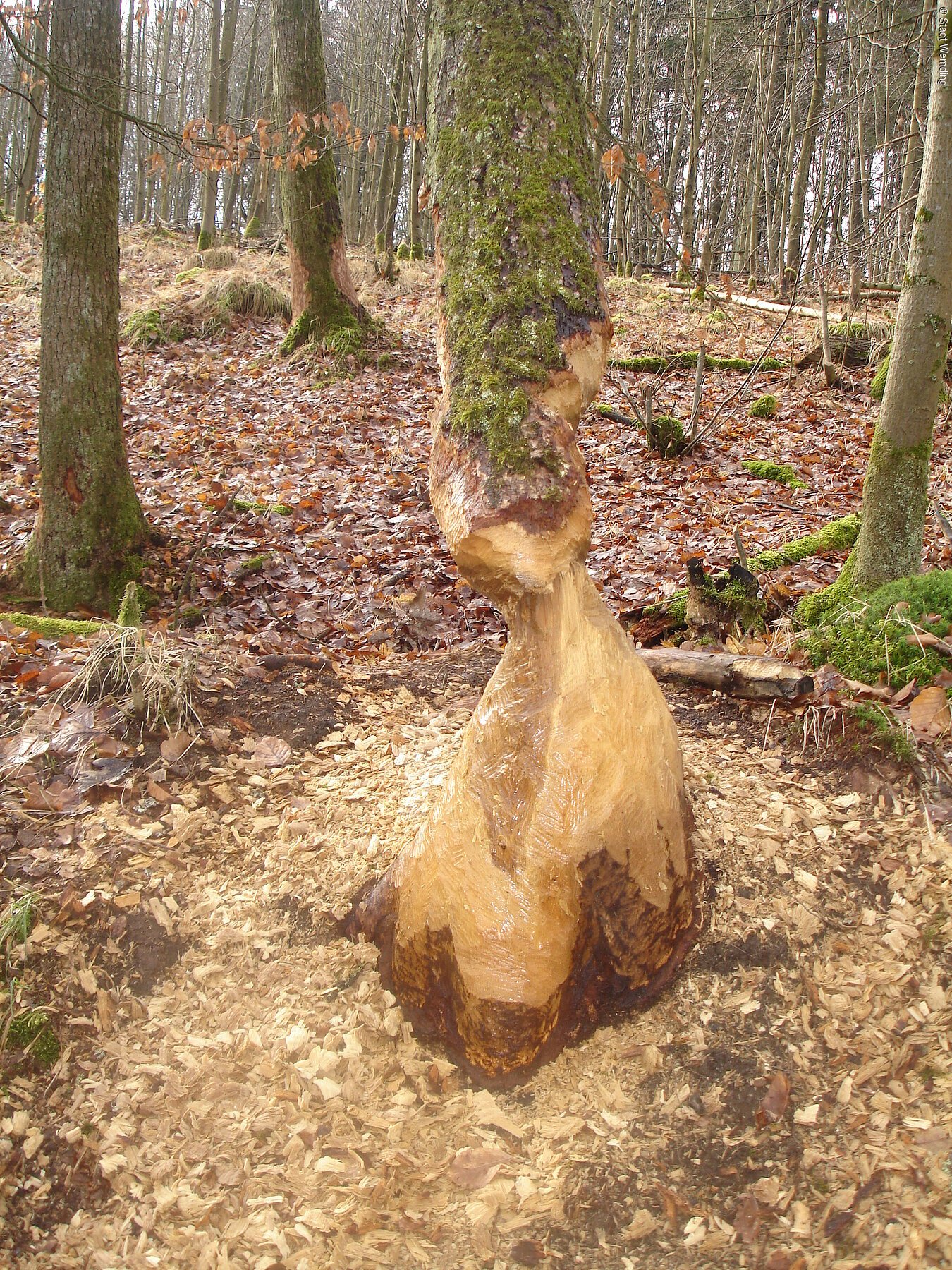 Landschaftsprägend sind die Spuren, die zahlreiche Biber um den Weiher hinterlassen.