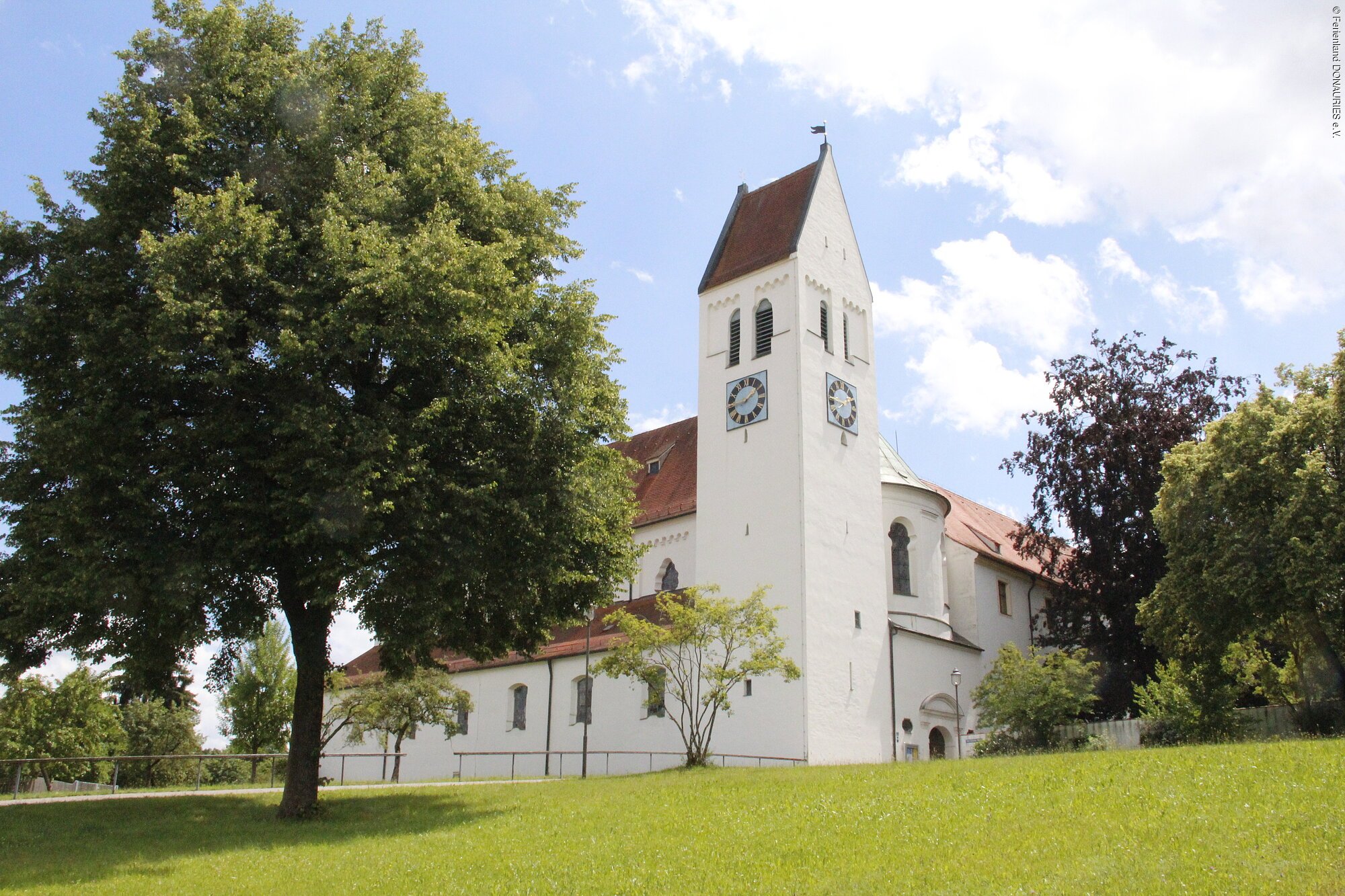 Die ehemalige Klosterkirche wurde im 12. Jahrhundert unter Abt Heinrich I. als eine der ältesten romanischen Backsteinbauten auf der bayerisch-schwäbischen Hochebene errichtet. Das Äußere der Kirche ist trotz Barockisierung (um 1714) eher schlicht. Ihr inneres Erscheinungsbild prägen heute die Fresken (1764) des Augsburger Malers Franz Joseph Maucher sowie die sparsam gesetzten Stukkaturen (1762-1765) wohl von Franz Xaver II. Feichtmayr.