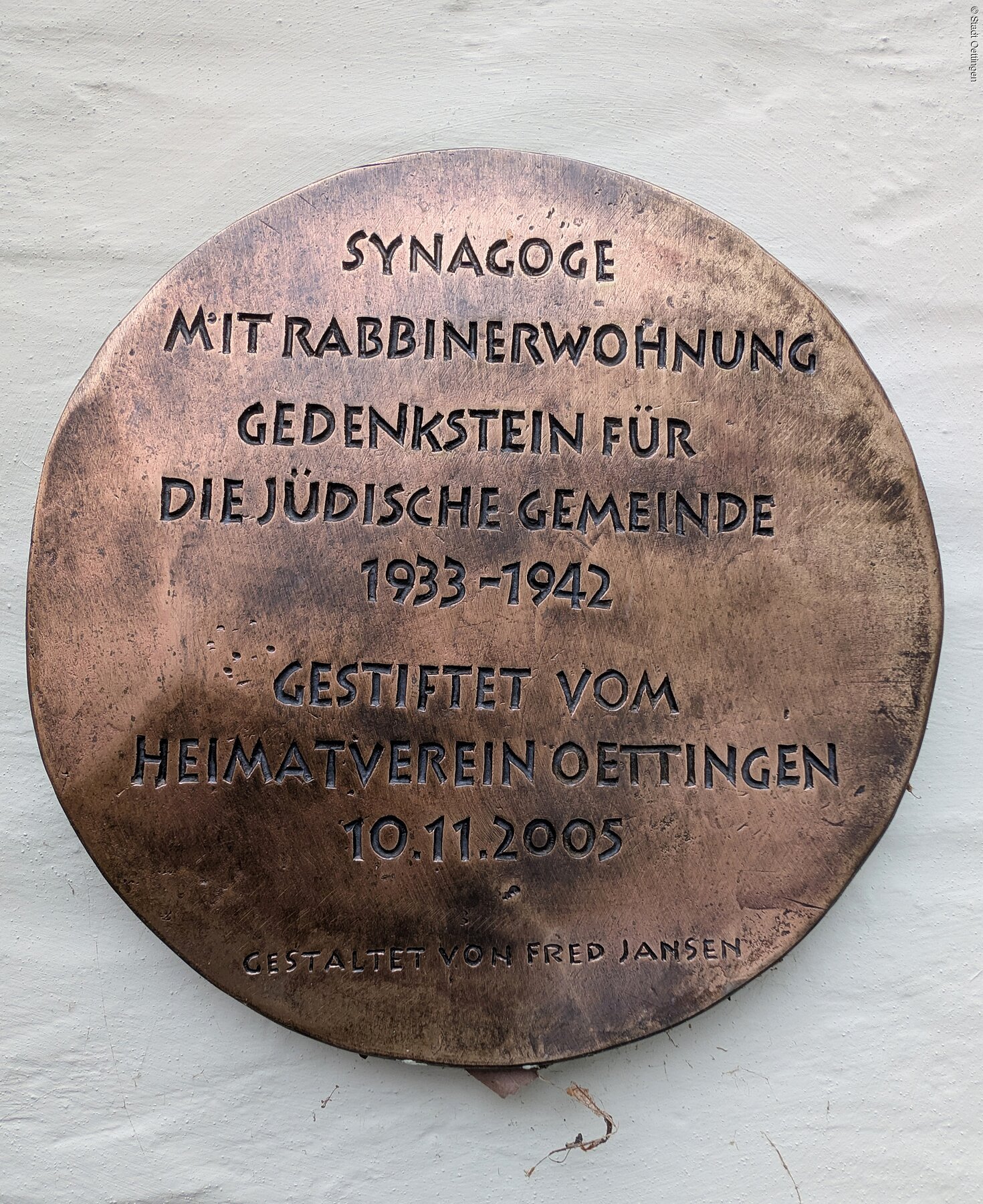 Nach dem 30-jährigen Krieg wuchs die jüdische Gemeinde in Oettingen, und der Wunsch nach einer eigenen Synagoge wurde immer stärker. Zunächst dienten private Räume und ein Stadel als Gebetsstätte.1676 erwarb die Gemeinde ein Anwesen an der Stadtmauer und baute den Stadel zur Synagoge um. 1852 entstand ein Neubau – das Einweihungsprogramm ist heute im Heimatmuseum Oettingen zu sehen. Bis Mitte des 19. Jahrhunderts war Oettingen Sitz eines Kreisrabbinats und Heimat mehrerer bedeutender Rabbiner.Am 10. November 1938 wurde die Synagoge geplündert und die ursprüngliche Ausstattung ging verloren. Heute ist vom ursprünglichen Gebäude nur noch das Ostfenster erhalten, das Gebäude wurde umgebaut und dient inzwischen als Arztpraxis.Seit 10. November 2005 erinnert ein Gedenkstein, gestaltet von Fred Jansen, an die zwischen 1933 und 1942 in Oettingen lebenden Juden – ein stiller Ort des Gedenkens und der Geschichte.