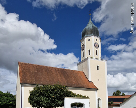 Die Chorturmanlage stammt im Wesentlichen wohl aus dem 15. Jahrhundert. Mitte des 18. Jahrhunderts grundlegende Erneuerung des Langhauses. Tafelbilder an der Emporenbrüstung Ende 17. Jahrhundert, hölzerne Apostelgruppe um 1500.