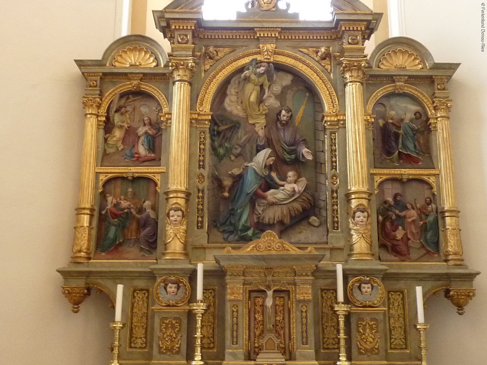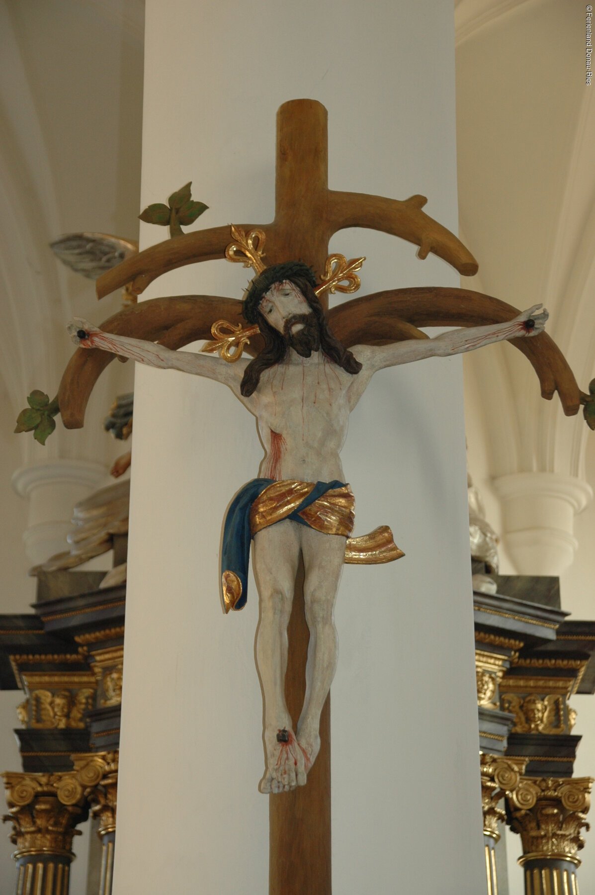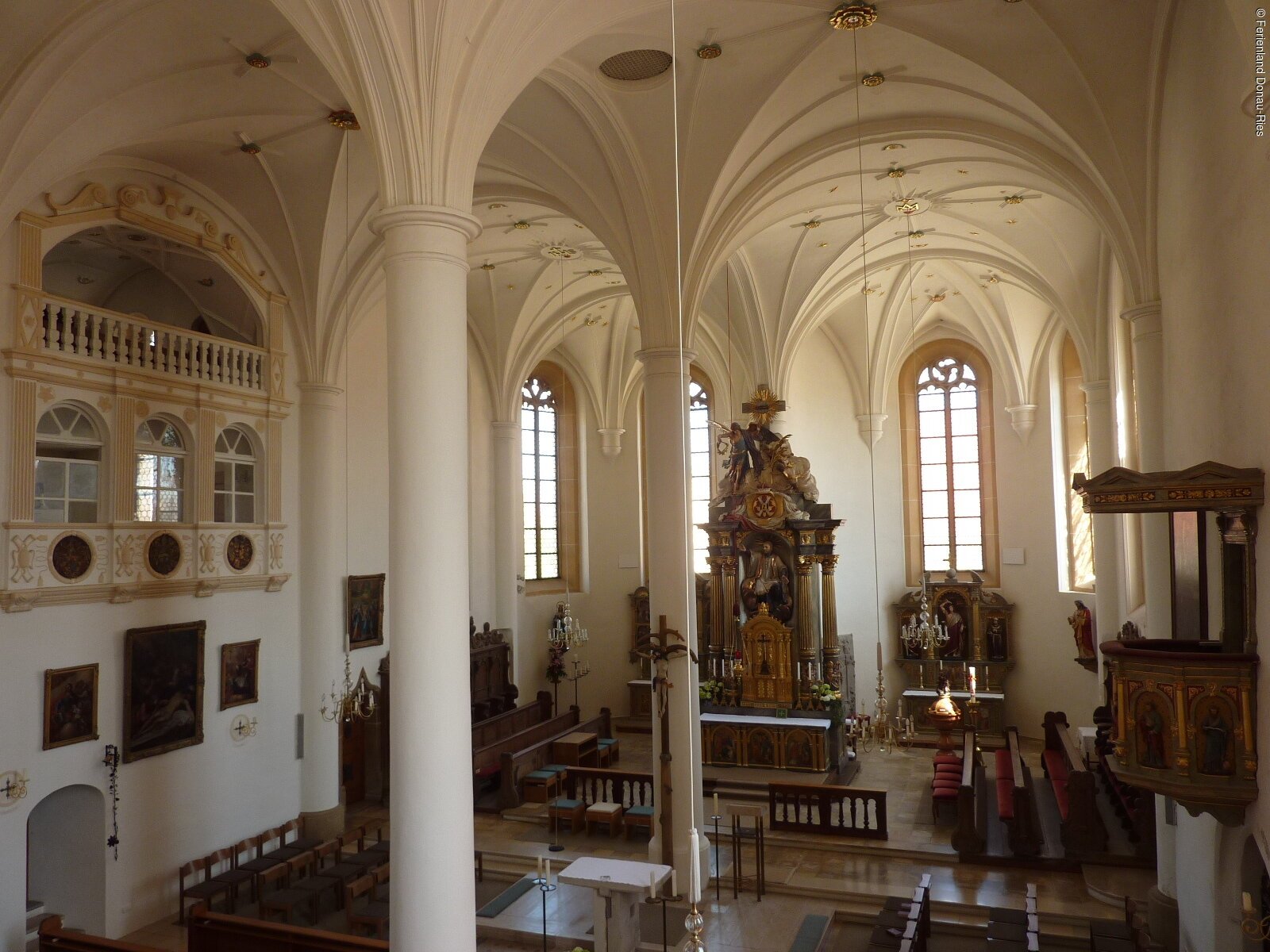 Erste urkundliche Erwähnung bereits 1274, die heutige Kirche wurde jedoch erst in den Jahren 1612/13 fertig gestellt. Für unsere Gegend stellt sie ein seltenes Beispiel einer nachgotischen, zweischiffigen, kreuzförmigen Halle dar. Über der Sakristei befindet sich das zweigeschossige Oratorium und der Fürstenstand. Besonders sehenswert ist außerdem das Kreuz als Lebensbaum mit Korpus um 1510. Die Epitaphien der Grafen in den Apsiden (1720) stammen von Johann Georg Bschorer, der 1720 – 1725 auch die wenige Meter entfernte Pestsäule inmitten der Hauptstraße schuf.