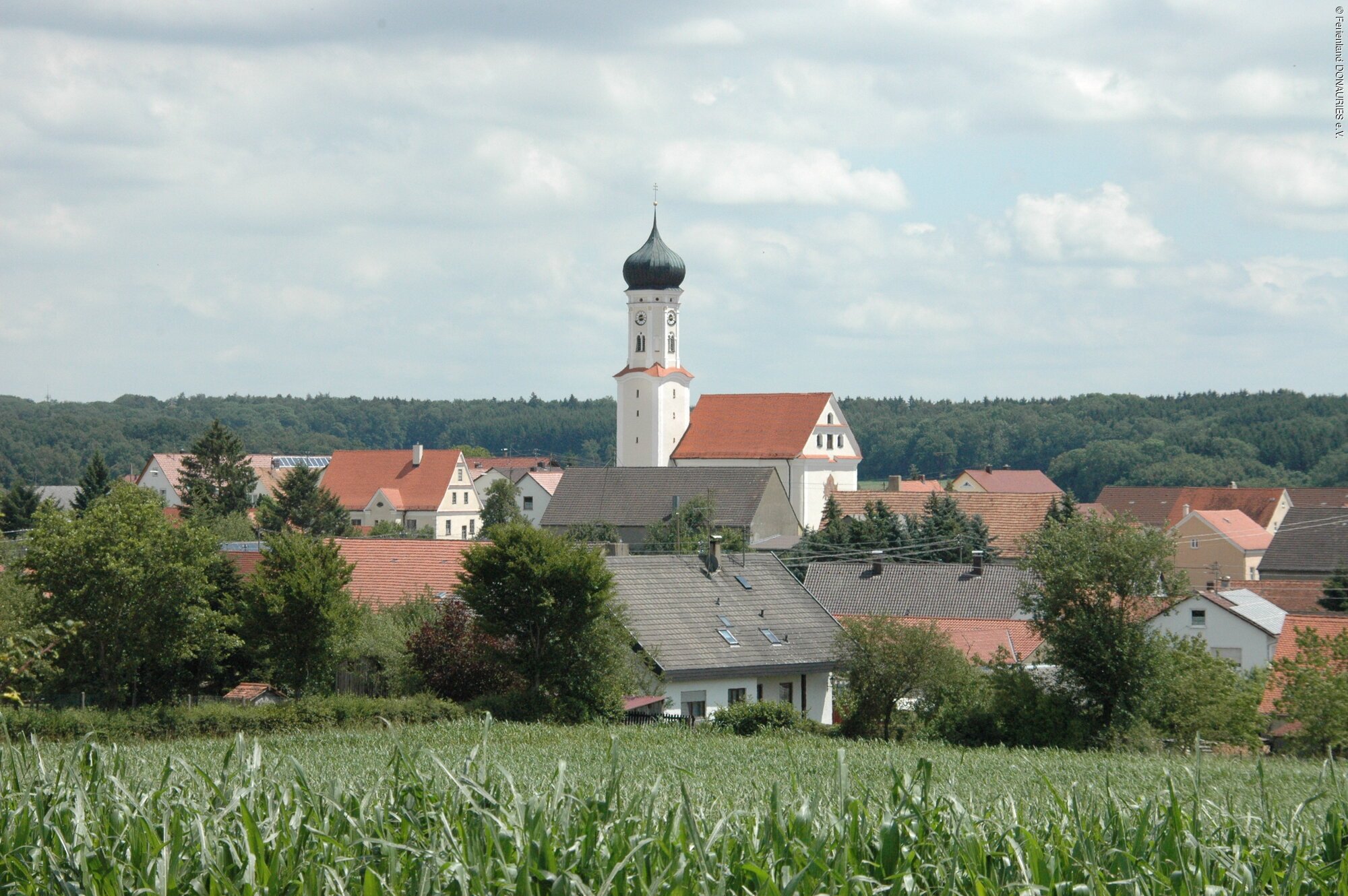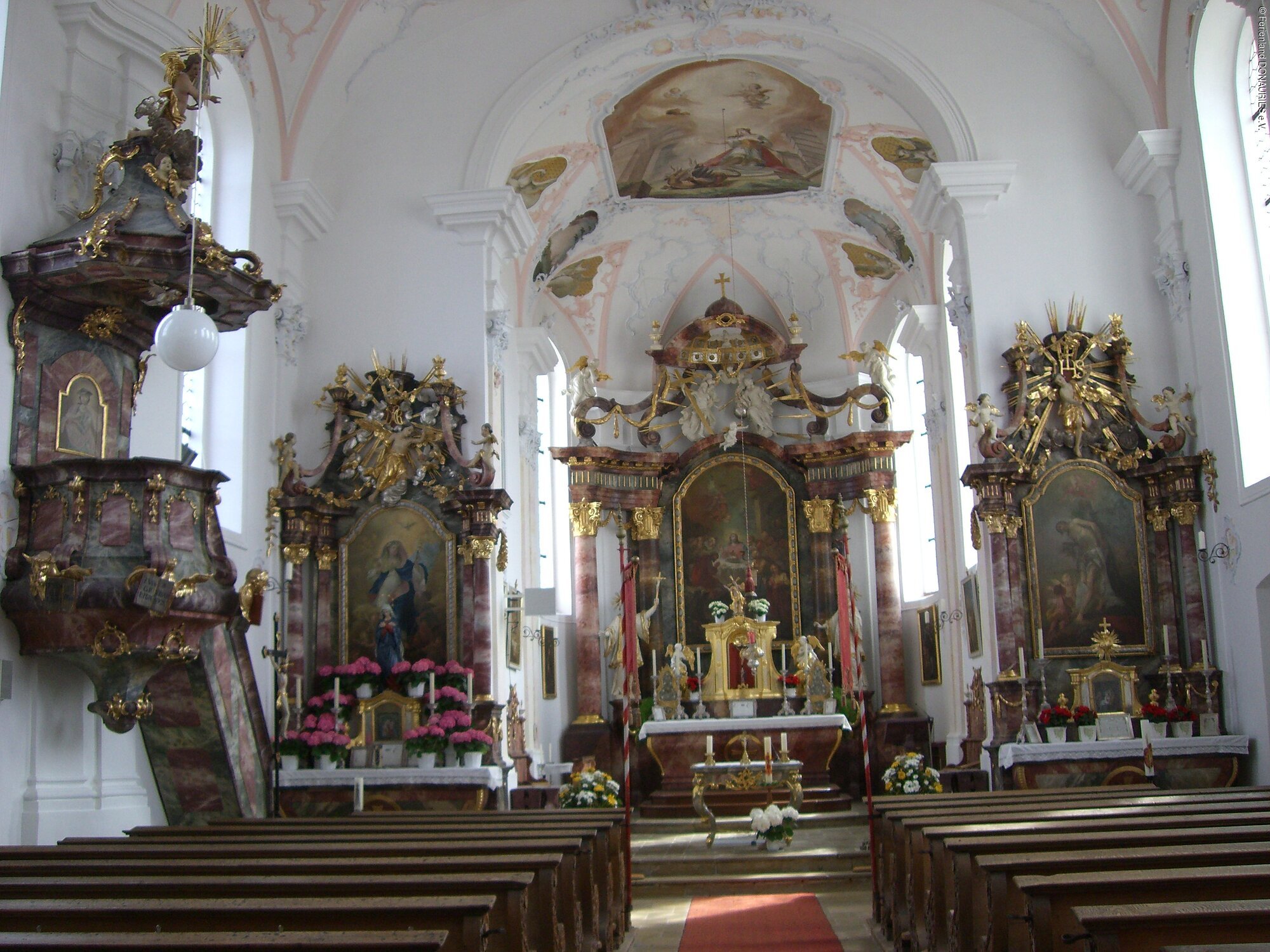 Der Kaisheimer Abt Cölestin I. Meermoos ließ den für die dörflichen Verhältnisse stattlichen, einschiffigen Bau unter Verwendung des spätgotischen Turmuntergeschosses um 1756/57 im reinsten Stil der Zeit errichten und ausstatten. Besonders erwähnenswert sind die eleganten Stukkaturen, prächtigen Deckenfresken sowie die klassizistischen Hoch- und Seitenaltäre mit Gemälden von Johann Baptist Enderle.