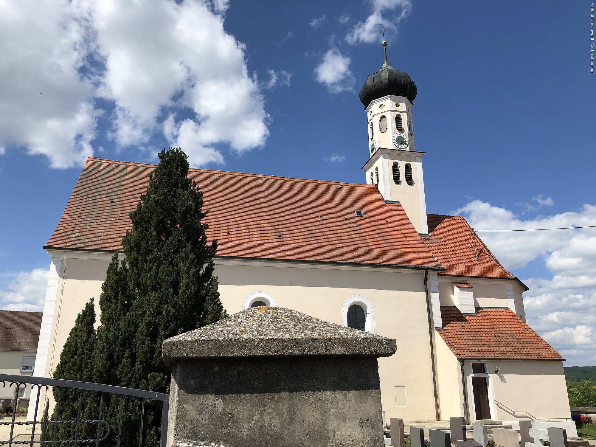 Nach Abbruch des alten Langhauses 1737 wurde das jetzige neu erbaut und die Kirche 1743 geweiht. Gegenüber der Kanzel befindet sich ein Kruzifix aus der Mitte des 18. Jh. Am Westgiebel ist das Wappen des Abtes Rogerius Friesl aus Kaisheim zu sehen. Um die Pfarrkirche ist ein Friedhof angelegt.
