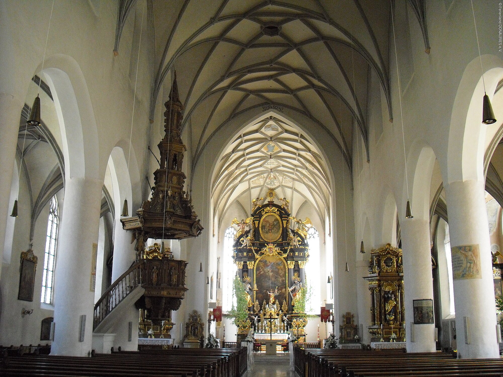 Die Kirche hat eine dreischiffige spätgotische Halle mit eingezogenem, geschlossenem Chor. Das Mittelschiff ist stark überhöht.Von der ursprünglichen Ausstattung hat sich nur wenig erhalten, so beispielsweise die Chorfresken, das gotische Sakramentshäuschen, die gotischen Steinportale, ein Taufstein aus dem 15. Jahrhundert, eine spätgotische Wallfahrtsmadonna und ein Kruzifix, aus der Zeit um 1510/20. Vieles der spätgotischen Einrichtung wurde 1555 durch einen Bildersturm auf Befehl von Pfalzgraf Ottheinrich vernichtet. Ihre hohe Qualität ist noch erkennbar an der erhaltenen ursprünglichen Ausstattung. Die allmähliche Neuausstattung der Kirche begann nach dem 30-jährigen Krieg, während der Rekatholisierung der Bürger.