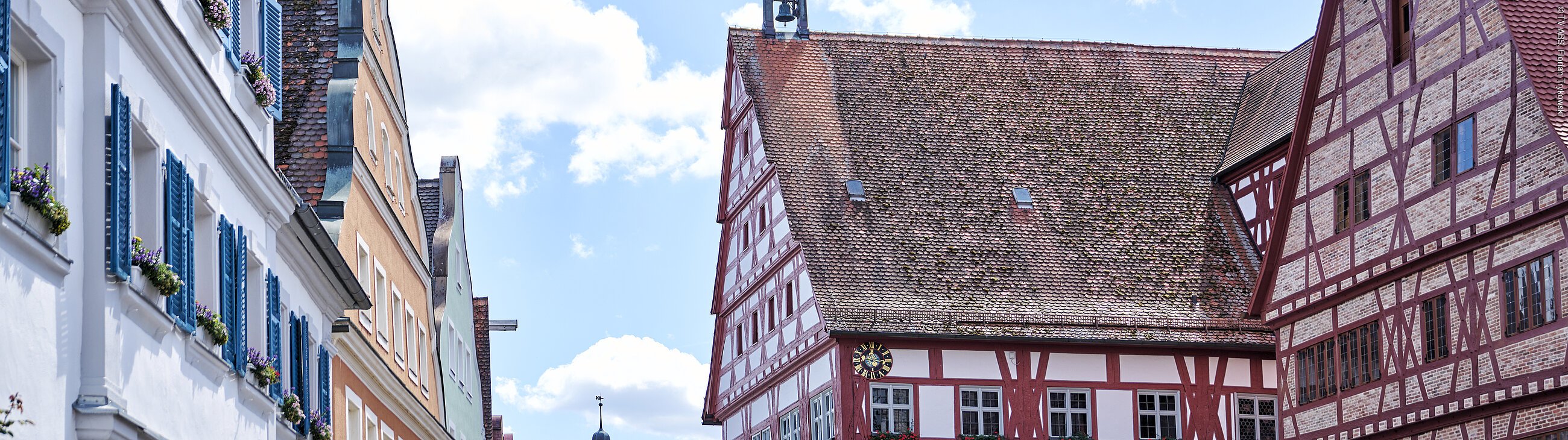 Der Marktplatz bildet das lebendige Zentrum der Oettinger Innenstadt. Architektonisch ist der Platz etwas ganz Besonderes: Die Fachwerkgiebel auf der Westseite stehen den barocken Giebeln auf der Ostseite gegenüber und erinnern eindrucksvoll an die jahrhundertelange Teilung der Stadt zwischen zwei Herrschaften und zwei Konfessionen. Ein Spaziergang über den Marktplatz ist damit zugleich eine kleine Reise durch die Geschichte Oettingens.Trotz vieler Umbauten ist die großzügige mittelalterliche Planung bis heute gut erkennbar. Einige Gebäude am Platz blicken auf eine beeindruckende Geschichte zurück: Das heutige Hotel Krone steht hier bereits seit über 600 Jahren, das Dachgebälk stammt aus dem Jahr 1424.