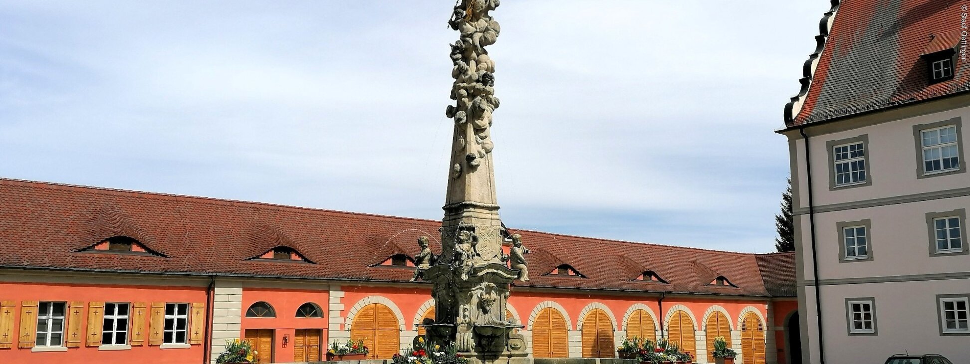 Im Zentrum des Schlosshofes steht der Marienbrunnen von 1720, geschaffen von Johann Meyer, umgeben von den historischen Schlossbauten wie Fremdenbau, Prinzessinnenbau, Remisen und dem Aufgang zum Schloss.