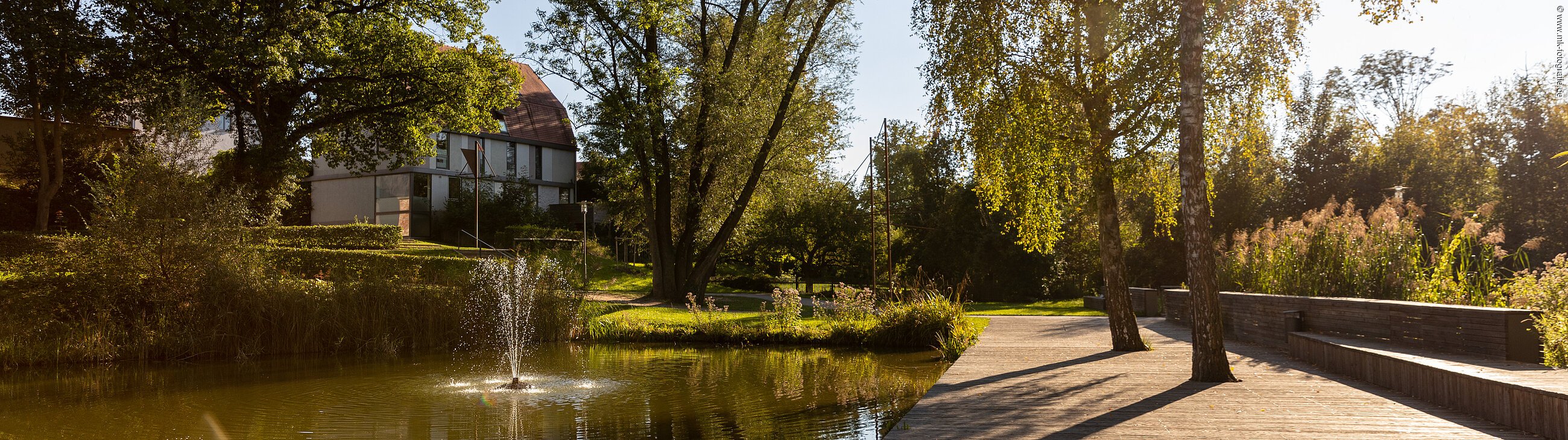 Der heutige Schlossweiher geht auf den wassergefüllten Graben vor der Schlossbastei zurück. Im Halbschatten einzelner Bestandsbäume bietet die große Holzterrasse, mit Blick auf das Schloss genügend Raum zum Treffen und Verweilen. Am südlichen Ufer fangen blühende Uferstauden den Blick auf. Immer wieder führen schmale Steintreppen ans Wasser.