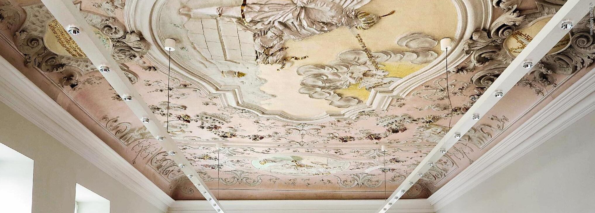 Während der Dienstzeiten können die einzigartigen Stuckdecken im Rathaus Monheim - Kenner behaupten, sie suchten in Mitteleuropa ihresgleichen - besichtigt werden.