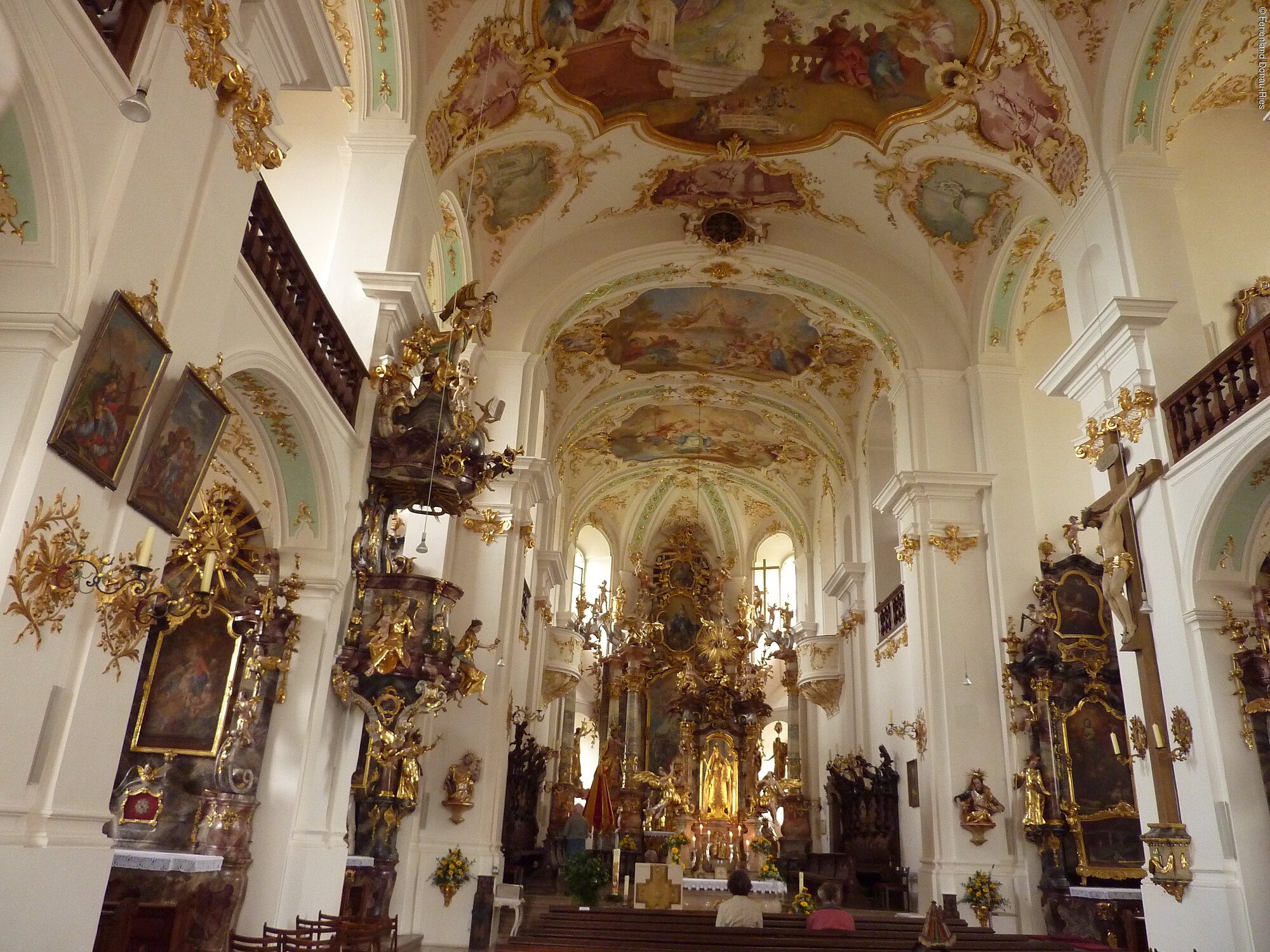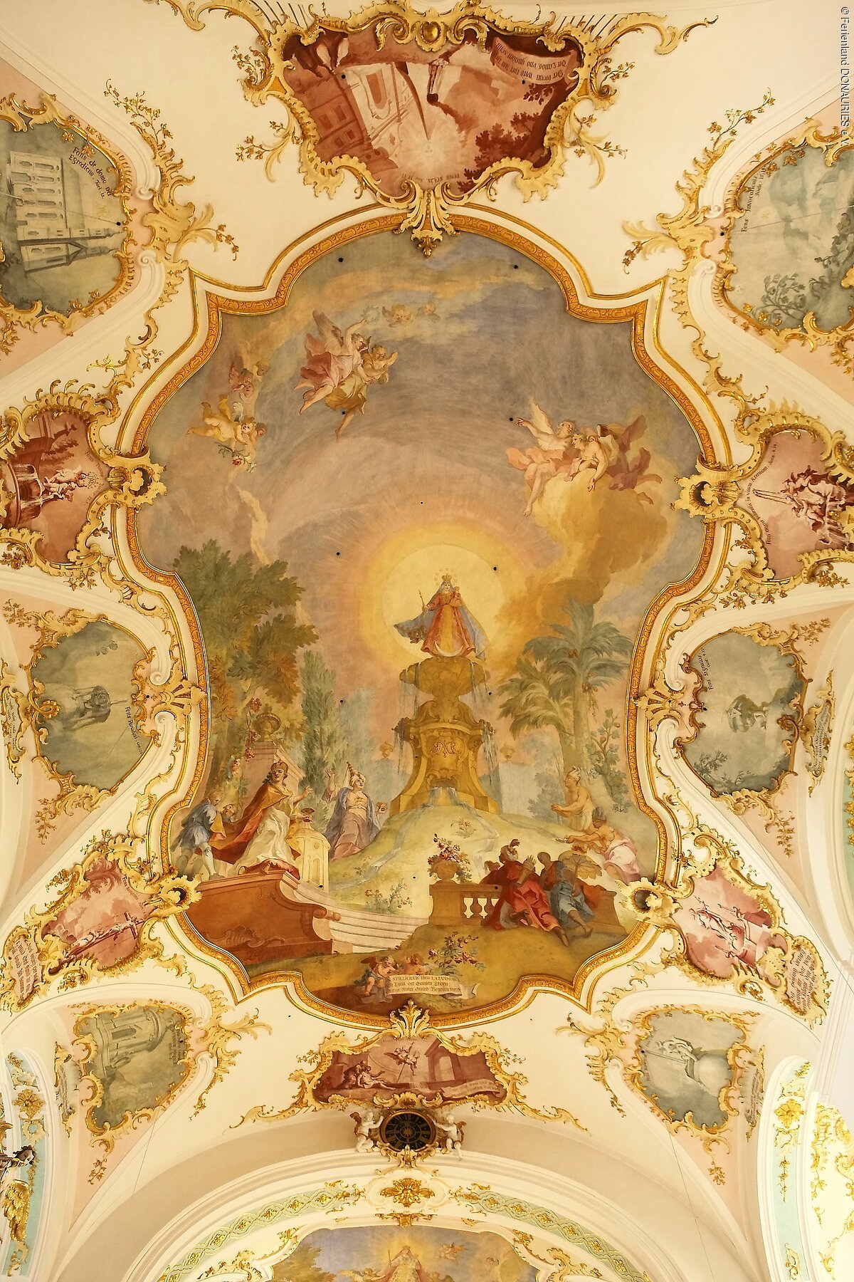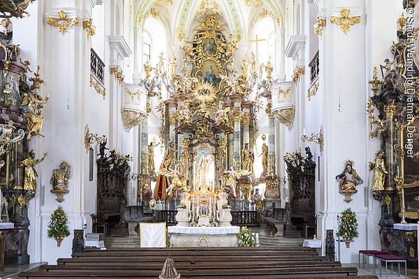Ausstattung mit eleganten Stuckdekorationen (1752 – 1754) und Fresken durch Johann Baptist Zimmermann. Herzstück der Kirche ist ein einzigartiger Gnadenaltar als Brunnenaltar mit der wundertätigen Muttergottes (1755) von Johann Joseph Mayr. Der Altartisch mit Brunnenschale wurde 1953 durch den lokalen Bildhauer Ernst Steinacker geschaffen.