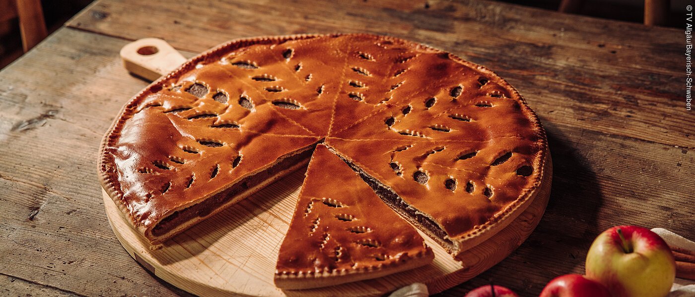 50 Zentimeter Durchmesser – wer die Rieser Bauerntorte zum ersten Mal sieht, staunt nicht schlecht. Diese Spezialität gibt es nur im Ries, zum Beispiel bei der Bäckerei Weißgerber in Wallerstein, wo die hauseigene Tortentradition mit einer Liebesgeschichte beginnt. „Eigentlich hatte ich gar nichts mit der Bauerntorte zu tun“, verrät Seniorchef Willibald Weißgerber, der gerade ein Exemplar der Spezialität zubereitet. „Bis ich mit 16 dann eine Freundin aus dem Riesgehabt hab’...“ – „Meine Oma“, wirft Enkelin Lena Scherer ein. Die Fertigkeit in Sachen Bauerntorte hat die Jahrzehnte überdauert. Mit routinierten Bewegungen platziert der fast 80-jährige Bäckermeister den Teig, bestreicht ihn mit der Apfelmusfüllung und ritzt das Kornähren-Muster in den Deckel.