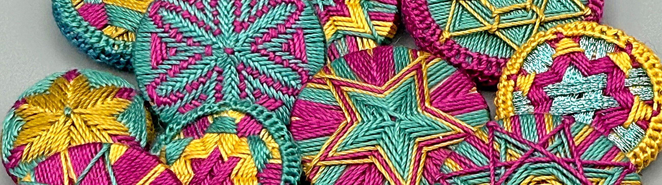 In der dunkelsten Zeit des Jahres ist das Bedürfnis nach Licht und Farbe besonders groß. Deshalb leuchten in diesem Kurs viele bunte Sterne: Über Holzrohlingen und Aluminiumringen entstehen Posamenten- und Zwirnknöpfe mit Sternmotiven in Jahrhunderte alter Handwerkstechnik – gewickelt, gewebt und gestickt. Die dekorativen Knöpfe eignen sich als Verschlüsse, beispielsweise als Ersatz für langweilige Kunststoffknöpfe an fertig gekaufter Kleidung, können aber auch zu Schmuckstücken weiterverarbeitet oder als Blickfang auf Hüte, Mützen, Taschen und andere Accessoires genäht werden.