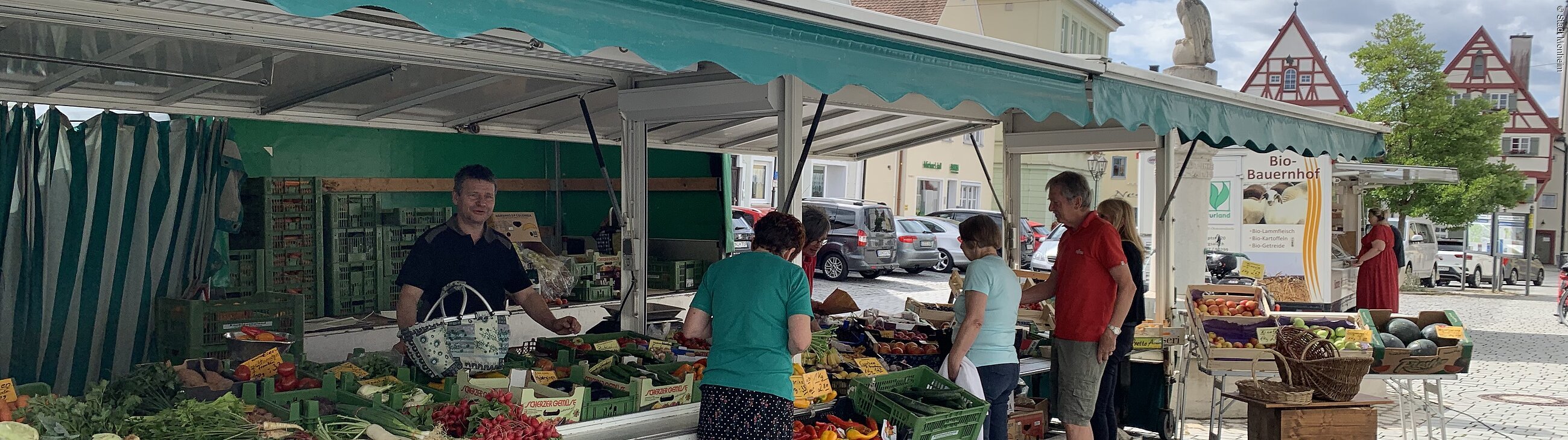 Jeden Freitag lädt der Wochenmarkt auf dem Monheimer Marktplatz dazu ein, frische und regionale Produkte einzukaufen.