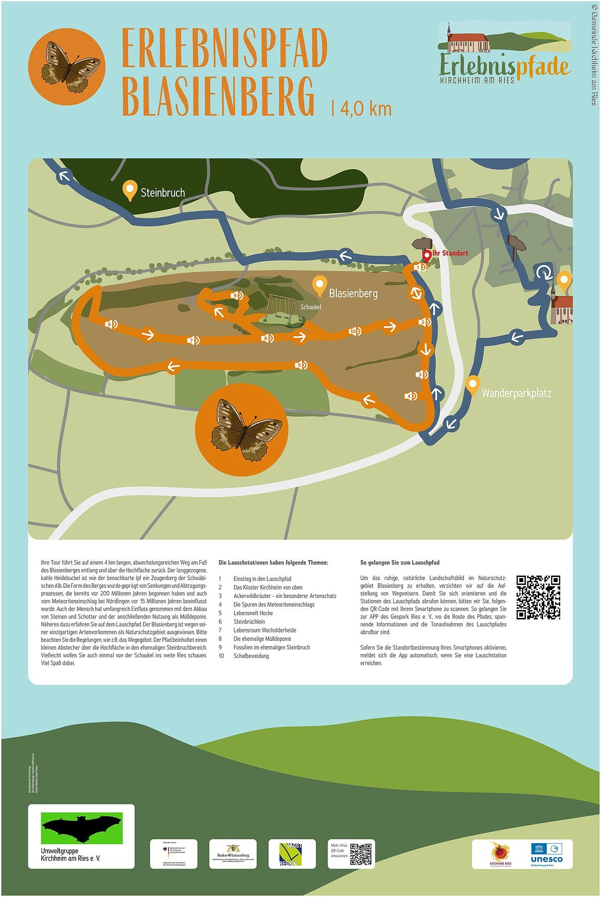 Der rund 4,5 km lange Pfad um und auf dem 600 m hohen und äußerst artenreiche Blasienberg wurde als Lauschpfad konzipiert. Erfahren Sie an 10 Lausch-Stationen mittels QR-Code mehr über die einzigartige Tier- und Pflanzenwelt und die geologischen Besonderheiten des Blasienbergs. Genießen Sie dabei den wunderschönen Ausblick ins Ries. Als Highlight können Sie diesen Blick auch schwingend auf einer atemberaubenden Ausblickschaukel erleben.