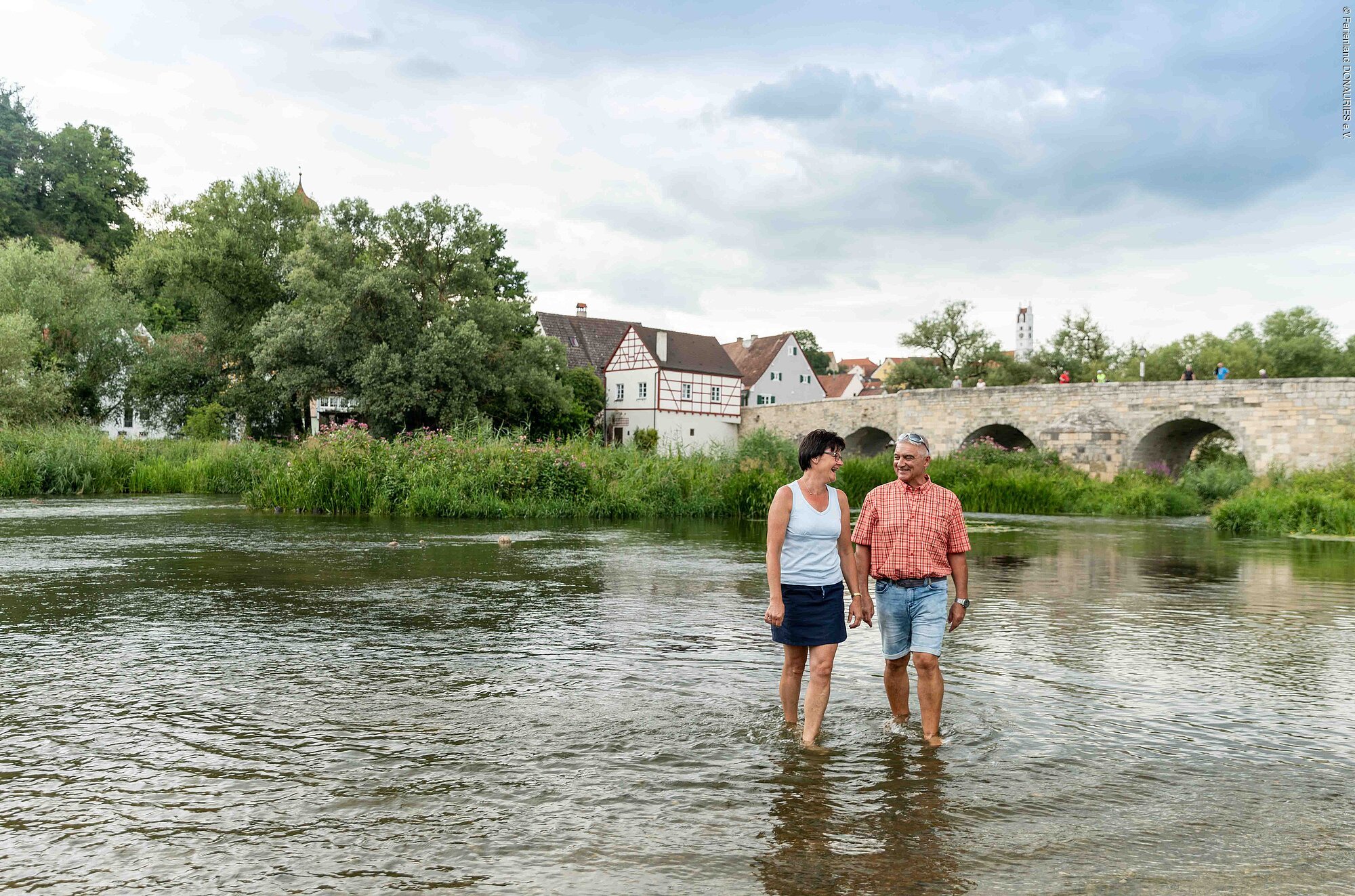 Vom Unteren Burgparkplatz führt der Weg auf idyllischen Wanderwegen hinab in die historische Altstadt zum Marktplatz mit historischem Brunnen. Auf einem Felsen über der Stadt thront hier majestätisch das Schloss Harburg, dessen Geschichte bis in das 11. Jahrhundert zurückreicht. Markante Landschaftsformationen säumen den Verlauf der Wörnitz – das einzige Fließgewässer, welches das Ries entwässert. Über artenreiche Magerrasen geht es zum Mähhorn oberhalb von Huisheim, das einen herrlichen Ausblick über das gesamte Ries erschließt. Am Geotop Kalvarienberg Gosheim eröffnet ein Steinbruch Einblicke in die Geologie des östlichen Kraterrandes. Durch Wälder quert man das Schwalbtal und wandert oberhalb des Wemdinger Steinbruchs entlang. Der Wemdinger Walderlebnispfad lockert den Etappenschluss mit Rätseln und Informationen zum Wald und seinen Bewohnern auf und ist insbesondere für Kinder attraktiv. Die erste Etappe endet an der Touristen-Info mit der nahe gelegenen Geopark-Infostelle Wemding.