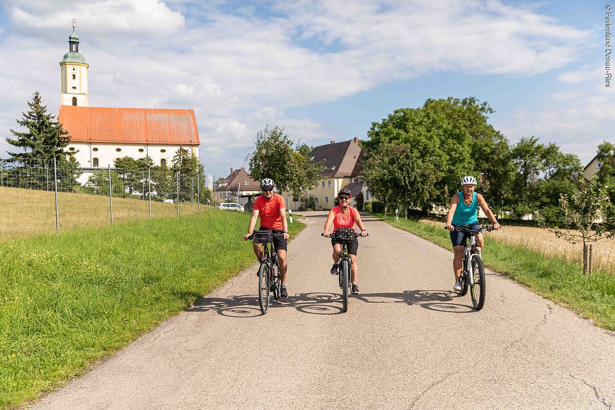 Wir starten in der Nähe der Stadtpfarrkirche St. Blasius und radeln zunächst auf dem Radweg Ries 1 entlang der B 29 stadtauswärts. Bald sehen wir rechts auf der Anhöhe die Burgruine Flochberg liegen. Auch die prächtige Wallfahrtskirche "Zu unserer lieben Frau vom Roggenacker" lohnt einen Abstecher. Bald lassen wir Trochtelfingen links liegen und gelangen südlich der Eger bleibend nach Utzmemmingen. Hier wechseln wir auf den Radweg Ries 1A und erblicken in Kürze linker Hand die Reste eines ehem. römischen Gutshofs im Maienbachtal, welcher sich am Fuße des Riegelberges unterhalb der Ofnethöhlen befindet. Wir setzen unsere Tour über Ederheim, Hürnheim, Nieder- und Hohenaltheim bis nach Mönchsdeggingen fort. Hier beeindruckt uns die Klosterkirche bevor es ab Ziswingen auf dem Radweg Ries 1 über Klein- und Großsorheim weiter nach Harburg geht. Die Burganlage auf dem Riesrand ist auf jeden Fall einen Abstecher wert. Unsere Tour führt uns auf der Alten Steinernen Brücke über die Wörnitz und aus dem Tal hinauf, bevor es über Huisheim nach Wemding geht. Unterwegs lädt das Geotop Kalvarienberg zu einem interessanten Einblick in die Erdgeschichte ein.