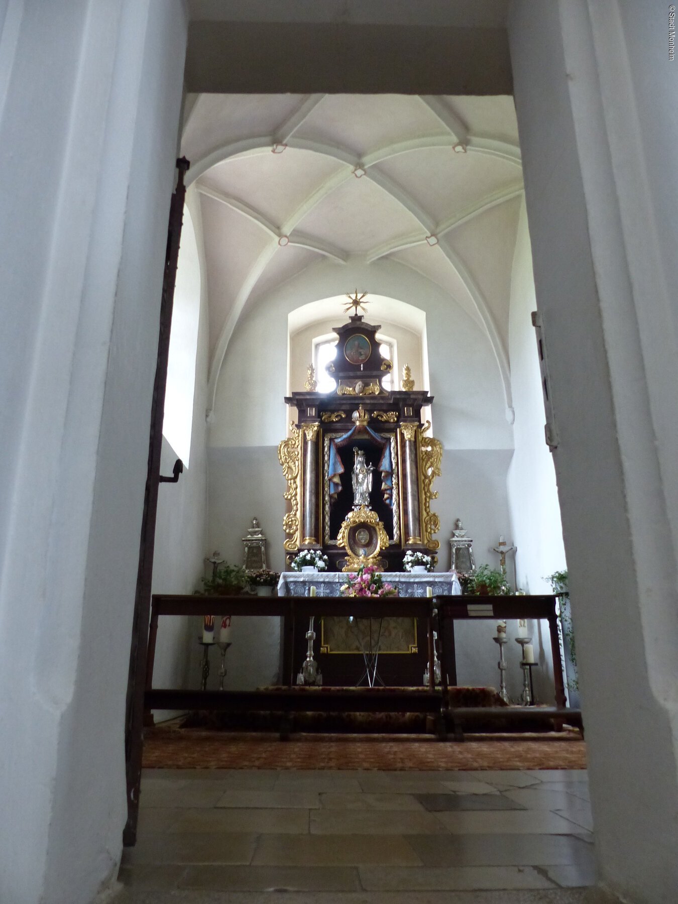 Auch die Stadtpfarrkirche, ein spätgotisches Bauwerk von 1509, sowie die Überreste des Benediktinerinnenklosters aus dem 9. Jahrhundert lohnen einen Besuch. Ein kurzer Aufstieg führt zur Brandkapelle, die 1851 als Dank für die Verschonung Monheims vor einem verheerenden Waldbrand erbaut wurde. Der angrenzende Kreuzweg lädt zur Besinnung und einer kleinen Rast ein. Weiter geht es zu einem Teilstück des Themenpfads „Zukunftswald Monheim“. Im weiteren Verlauf des Wanderwegs gelangen wir zu einer Ringwallanlage, deren Geschichte bis ins 5. Jahrhundert v. Chr. zurückreicht – davon zeugen Funde wie eine hallstattzeitliche Paukenfibel und mittelalterliche Mauerreste. Weiter geht es zur Ortschaft Ried. Von der Rieder Höhe genießen wir im Anschluss die idyllische Aussicht auf das Gailachtal. Der Weg führt talwärts über die Gailach und vorbei an der Monheimer Kläranlage, die mit innovativer Technologie zur Reinhaltung des empfindlichen Karstgebiets beiträgt. Zurück in Monheim passieren wir die kleine Peterskapelle, die von der frühen Besiedlung im 8. Jahrhundert zeugt, und erreichen schließlich die ehemalige „Lutherherberge“. Hier fand Martin Luther 1518 Schutz, nachdem er Augsburg fluchtartig verlassen musste: ein spannender Abschluss für unsere Wanderung durch Natur und Geschichte der Region.
