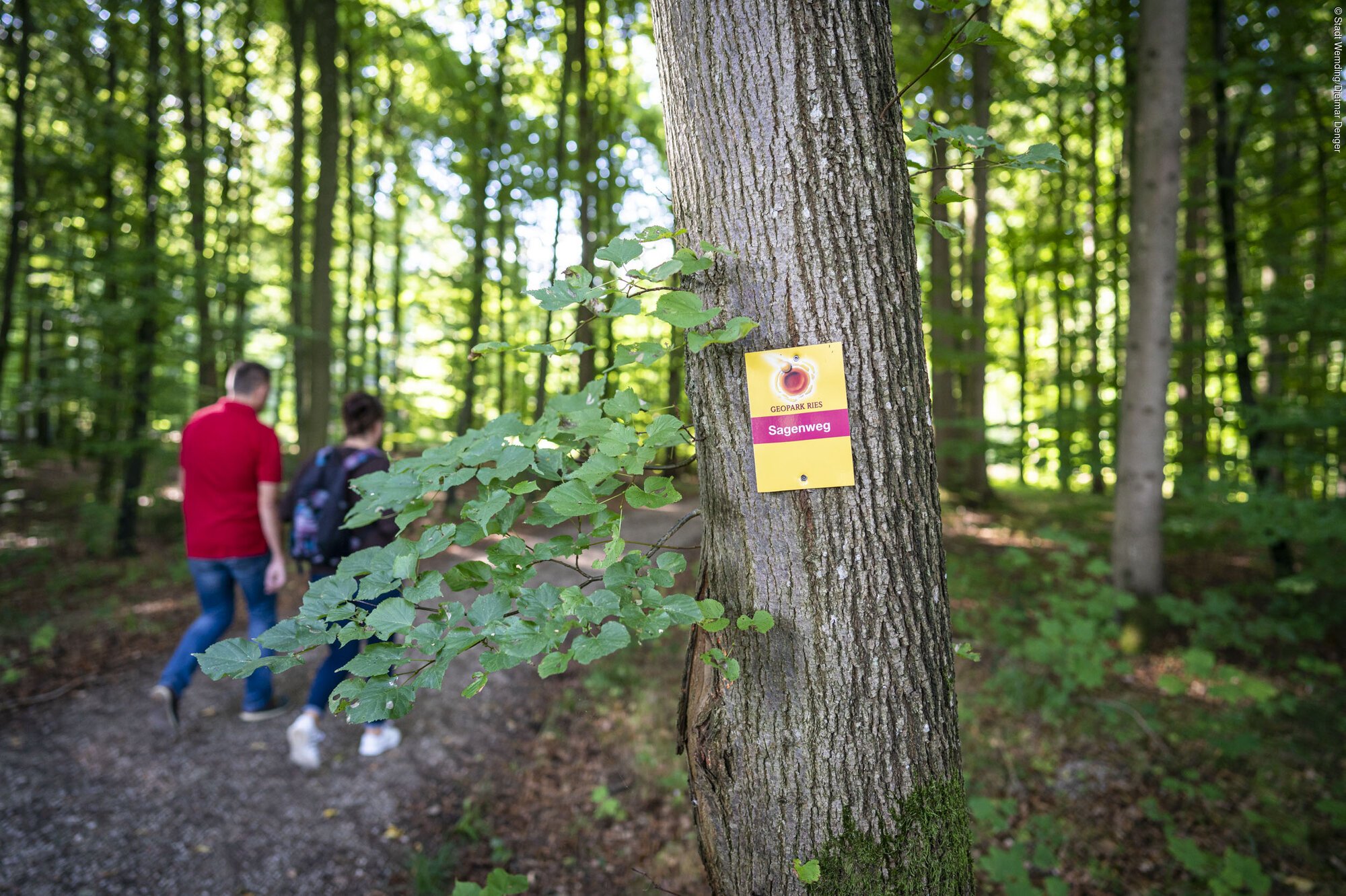 Als Startpunkt der Wanderung empfehlen wir den Johannisweiher in Wemding. Von hier geht es zunächst hinauf zur „Schönen Aussicht“, die hält, was sie verspricht. Wir wandern weiter zum Waldsee, wo sich ein Abstecher zum Kalksteinbruch anbietet. Weiter geht's durch herrliche Mischwälder bis am Wegesrand urplötzlich eine kleine Waldkapelle auftaucht. Hier soll sich bei einbrechender Dunkelheit das Huaterle, ein Männlein mit breitkrempigem Hut, herumtreiben. Auch am Doosweiher, wo sich zudem ein Suevitsteinbruch befindet, soll es schon gesehen worden sein ...